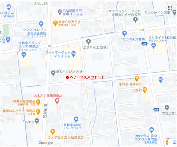 周辺地図 ヘアーコスメブロード 〒435-0052 静岡県浜松市中央区天王町1506-1 TEL 053-462-3196 アクセス 笠井街道沿い、フードマーケットマム入口横 営業時間 9:00~19:00(予約優先) ※最終受付・カット18:30 ・カラー・パーマ17:30・ 縮毛矯正16:30 定休日 毎週月曜日 駐車場 マム駐車場
